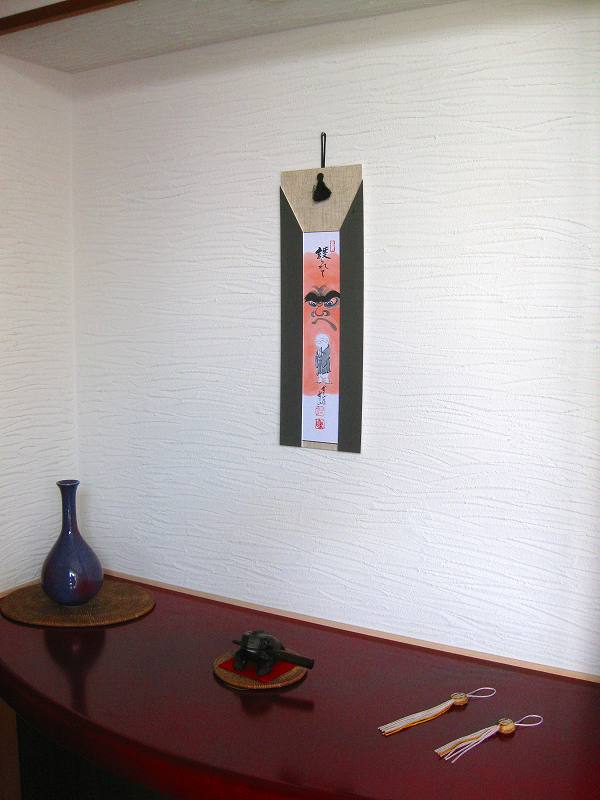 自宅にかかっている達磨さんに護られての作品短冊です. じつは短冊の額も横山雪山先生の手作りなんですよ。もし気に入られてご要望がありましたらお問合わせくださいね。お待ちしています。